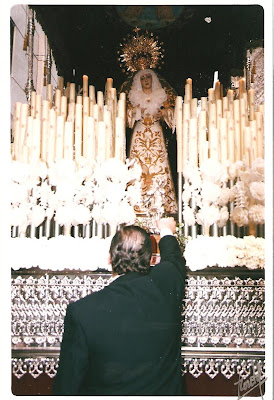 "Ocho años mirándonos cara a cara. Ocho años siendo tu secreto enamorado. Con que cariño guié tus primeros pasos por las calles de esta bendita Ciudad. Saliste en tu humilde paso, sin palio, sin música, de una nave abandonada. Y yo allí abriéndote paso y Tu, Madre mía, con el porte de una Reina cautivaste los corazones de todos. Me concediste el gran premio de verte la cara siempre que levantaba la mirada durante ocho años. Una vez cumplidos éstos llegamos a un secreto acuerdo. Me cambiaste el premio por otro quizás mejor para mí. Desde entonces tengo el inmenso privilegio de gozar de la compañía de los míos y poder ver crecer a mis hijos."