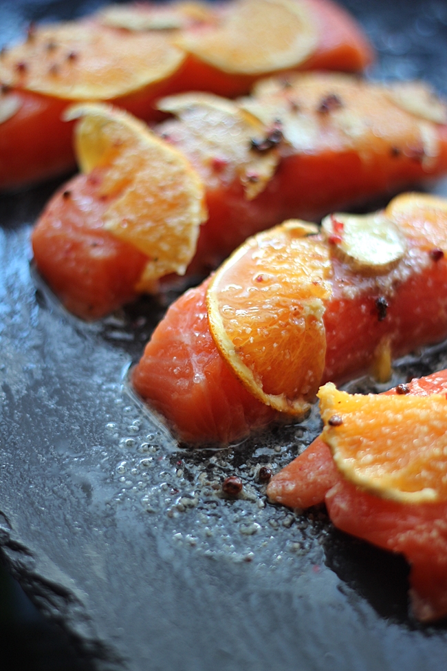 Disponha os medalhões de salmão num tabuleiro com os ingredientes da marinada : sumo de laranja, rodelas finas da laranja, gengibre, alho em pó, funcho, pimenta rosa e o vinagrete. Tempere com um pouco de sal. Tape com pelicula aderente e deixe a tomar gosto cerca de 30 minutos.