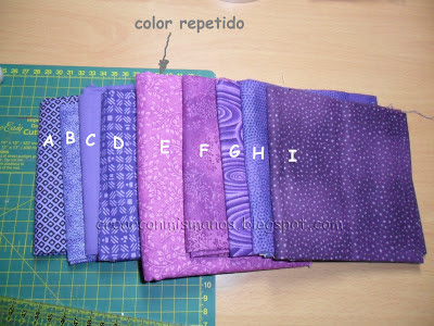 El material necesario en tela que yo he empleado han sido 9 colores diferentes. En este caso he utilizado fat quarters o lo que es lo mismo piezas de 50x55cm. He utilizado 1 para cada color, menos para la zona central que he utilizado 2. En total 10 cuadrados, uno repetido. Vamos a llamarlos A-B-C-D-E-F-G-H-I