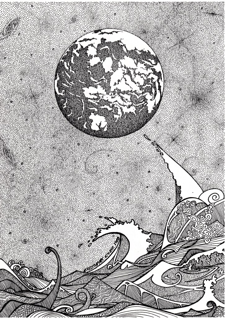 The drawing below was actually done first. I felt the sphere represented the unity and wholeness of our Earth when we step back, while the lines represent the complexity we experience when we come in close. I also felt the drawing was similar to a mother’s womb or egg, representing the hidden creativeness of life within life. The image above has similar meaning, although the plant leaves definitely represent the mysterious beauty of growth.