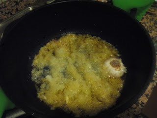 A continuació, sempre dins la mateixa cassola, comencem a sofregir la ceba, tallada ben petita, a foc mig baix. Quan comenci a caure, hi incorporem la cabeça d'alls partida per la meitat horitzontalment, i sense pelar.