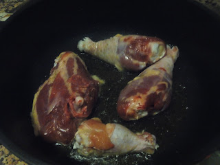 Primerament, daurem el pollastre en una cassola amb oli, a foc fortet, per tal de segellar-ne la carn prèviament salpebrada. Reservem.