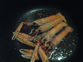 En la mateixa cassola, aprofitant el greix que n'ha quedat, també mig fregim mig saltegem el marisc, és a dir, les gambes i els escamarlans. Reservem.