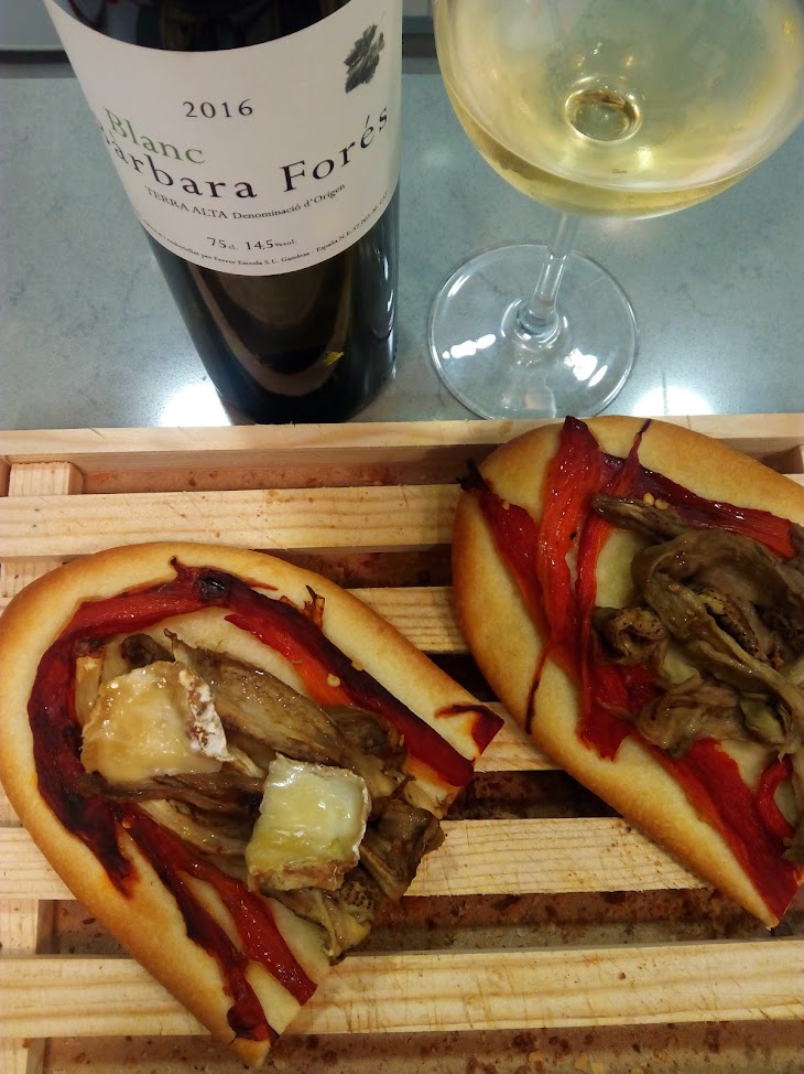 Coca d'escalivada i formatge El Bastard de Murgó Formatges (St. Iscle de Vallalta) amb Garnatxa Blanca de Bàrbara Forès