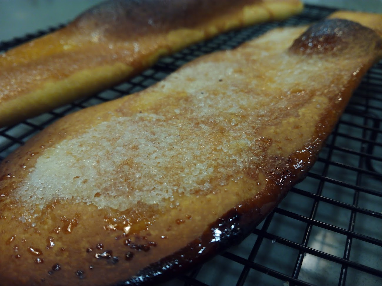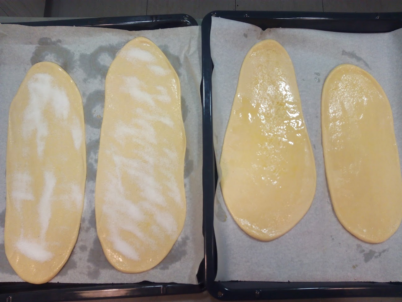 | mateixa fornada: coca de recapte i coca de vidre pintada amb oli, anís i sucre |