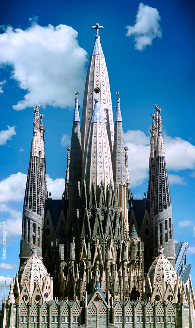 Le torri dedicate agli apostoli, agli evangelisti, a Maria Vergine e a Gesù, per il loro aspetto bizzarro sono state paragonate a termitai o a castelli di sabbia. Gaudì non si accontentò delle forme disponibili nella storia dell'architettura... ma attinse al repertorio della natura con l'intento di migliorare tenuta e staticità. Ogni torre ha una struttura paraboloide e, all'interno, una scala ispirata alle lumache di mare, mentre le colonne della basilica sono concepite come una foresta.