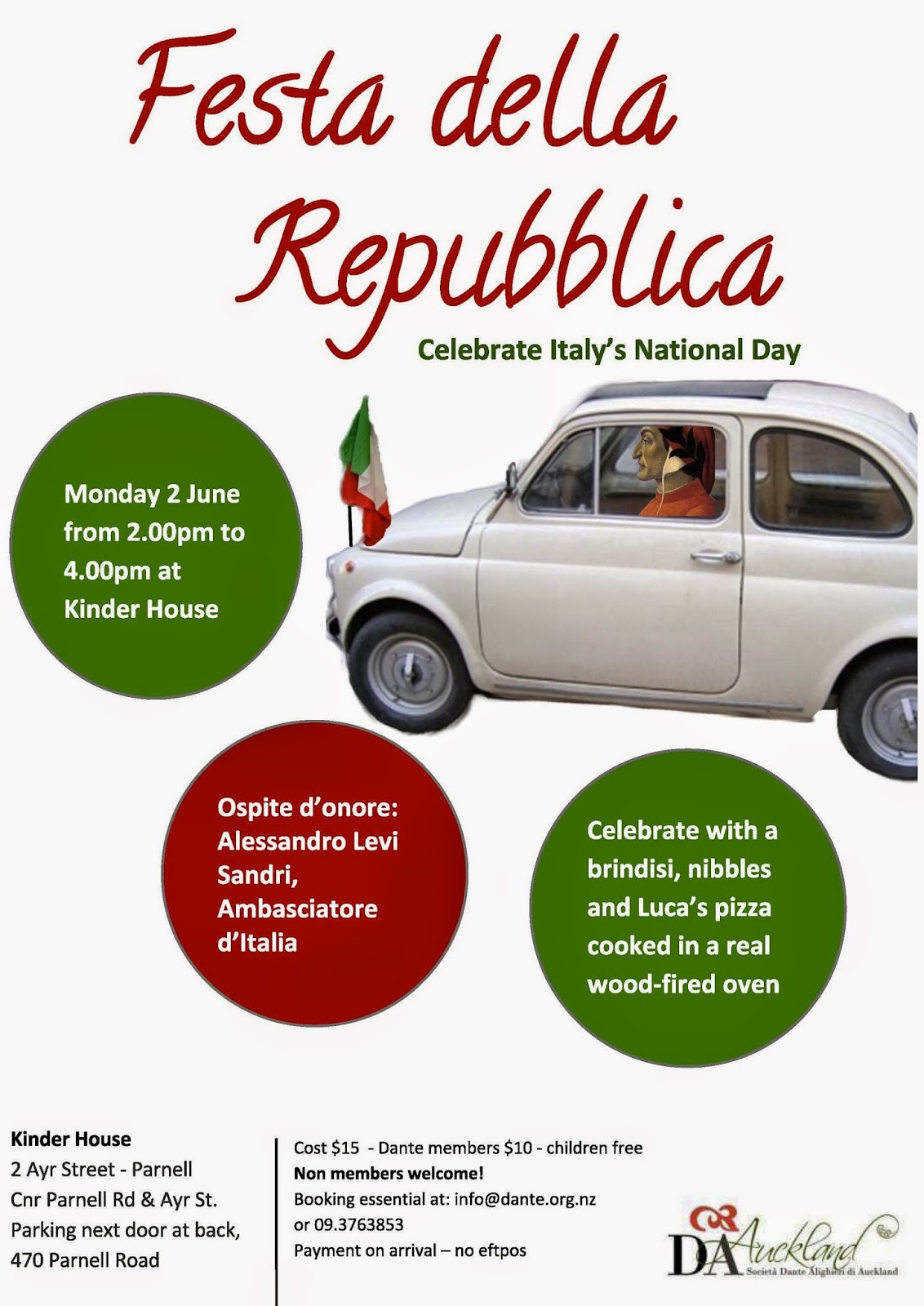 Venite a celebrare con la comunità italiana di Auckland la Festa della Repubblica, con un brindisi all'italiana, rinfresco e pizza cotta con il forno a legna da Napoli Central.