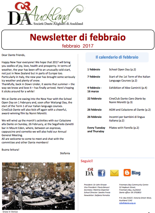 Also, our Colazione alla Dante will on 26 February at the Segafredo Zanetti bar in Mount Eden, where we will also hold our Annual Meeting.