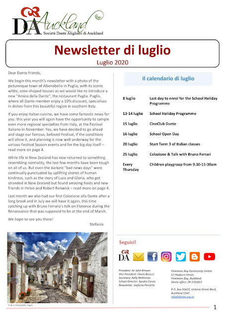 So far 2020 has been a difficult year, and the future is still uncertain. Yet at the Dante we want to be positive, forward looking, and contribute to the post-Covid social and economic recovery. So I am pleased to inform you that on Saturday 27 June the Dante Committee voted in favour of holding Festival Italiano in 2020, and further promoting Italian culture with an Italian Festival Season in Auckland.