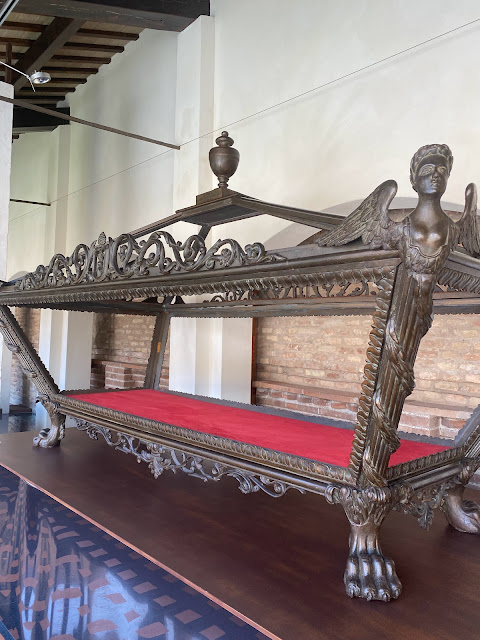 On that occasion, the remains were reassembled and put on display in a crystal urn for a few months. The crystal urn, without glass, is now displayed in the Dante Museum (see photo below), and so is the Franciscan friars' wooden chest.