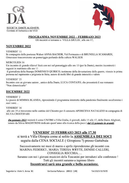 Il Comitato Verbanese della Dante Alighieri (Dante Alighieri Society Verbania) and del VCO (Verbano-Cusio-Ossola) was founded in 1906. Verbania is the most populous comune (municipality) and the capital city of the province of Verbano-Cusio-Ossola in Piedmont. It is situated on the shore of Lake Maggiore. A very active society (see the program below for this trimester) located in a beautiful part of Italy! An article about the meeting also appeared on the local newspapers Verbano on 13 January and Eco Risveglio (see the clippingS at the end of the page).