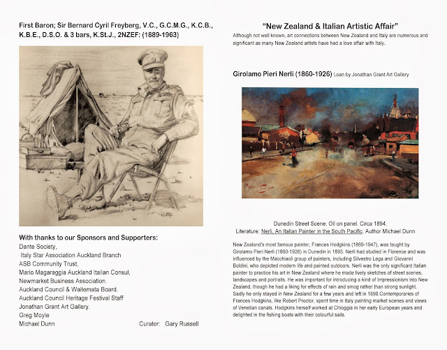 A talk by Dr. (Prof.) Michael Dunn will illustrate the historical links of both areas in both the styles and locations of the art works, from water and coastal landscapes to the WWII images of the New Zealand soldiers of the 2nd NZ Expeditionary Force. Supporters and contributors to this exhibition are the Italy Star Association Auckland, ASB Community Trust and the Auckland Dante Society.