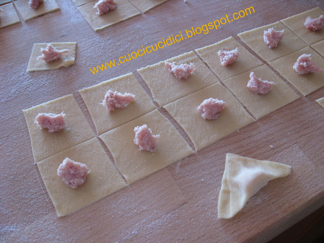 Prepare the dough, mix egg (or eggs) with flour , form a ball and cover it for half an hour it with a bowl.Meanwhile, mix all the ingredients in a bowl for the filling and refrigerate the time needed to roll out the dough very thin; cut the dough into small squares and in each of these place a very little ball of filling, close forming a triangle and close the tortellino.
