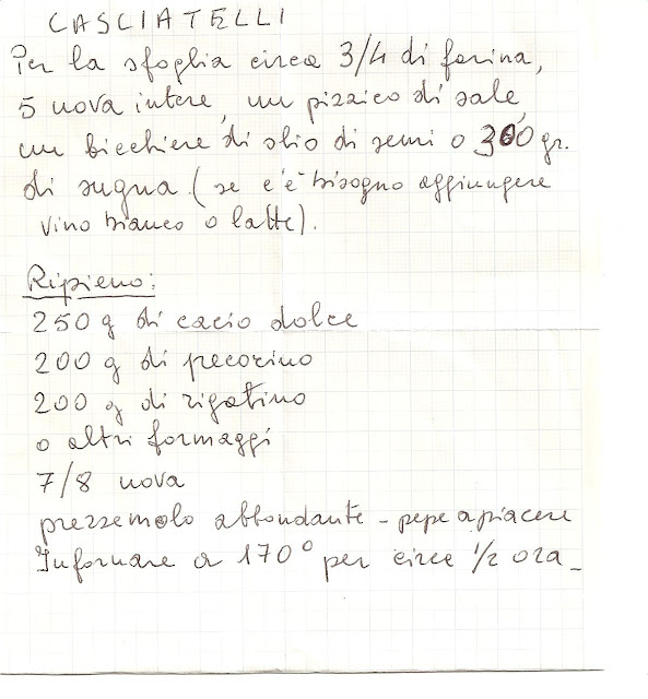 Today's recipe comes from a very talented blogger and home cook, Loredana from the Blog La cucina di mamma Loredana. Loredana lives in Abruzzo, but she comes from Molise, and her family eat these traditional cheese pastries at Easter. In fact the handwritten recipe is from her grandfather! Can you read it? Cacio dolce, pecorino and rigatino are all cheeses (that you can substitute with other types), and for the pastry you can use vegetable oil or sugna; can you guess what sugna is? Try to find out!