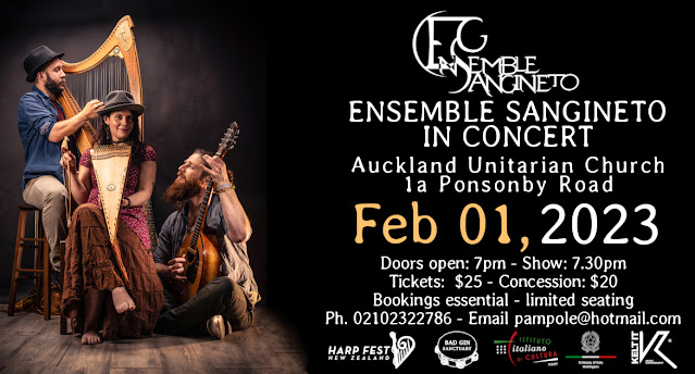 Italian trio Ensemble Sangineto is touring Aotearoa and will be in Auckland on 1 February. For booking and info contact Pam Pole: