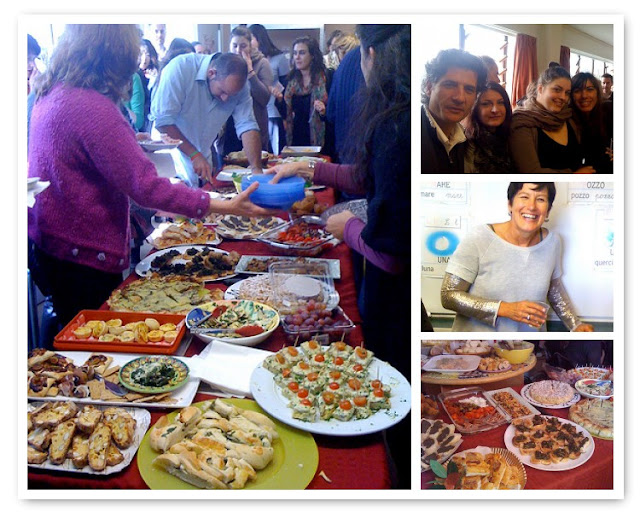 And of course we had pasta for lunch, the choice was burro e parmigiano or Sorrentina (tomato, basil and mozzarella) and most kids wanted both!! Lovely tables were set with tablecloths, proper plates and a basket of bread and focaccia (real Italian style), and were packed with kids from 5 to 12, happily eating and conversing. Some came back for second helpings too! And for dessert we had seasonal fruit (mele, pere, mandarini e kiwi), plus Mulino Bianco biscuits for a final treat.