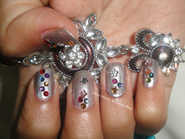 I wanted to bling up my nails for new year's eve , that is why i decorated my nails with rhinestones , a silver foil polish looks better with rhinestones.