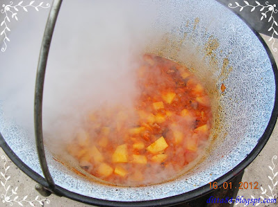 Még talán a múlt évben láttam a paprika tévén, a Táj-Föld című műsorban,ezt az ételt,sokszor hallottam már róla,de enni még nem ettem.Vártuk,hogy egy picit olyan idő legyen,meg időnk is legyen rá,hogy kint bográcsban elkészítsük ezt az ételt, ma egészen tűrhető idő van kint,jó azért hideg van,de legalább szélcsendes,és nem esik semmi.Bent elkészítettük az alapanyagokat : szalonnát,,füstölt tarját,hagymát krumplit,felkockázva,felaprítva,3ek lecsót,pirospaprikát,sót,és a lebbencstésztát.