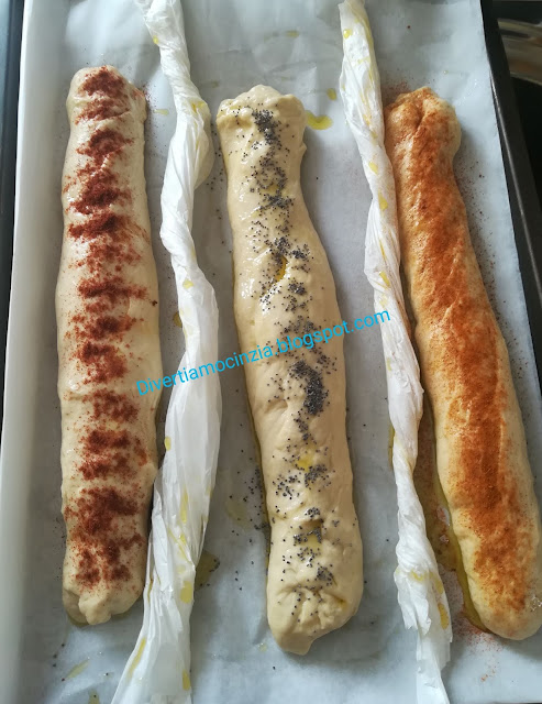 dei tagli obliqui su ogni filone, ungere con olio d'oliva e cospargere un filone con semi di papavero,un altro con curcuma e l'ultimo con peperoncino (naturalmente potete usare tutti i semini che volete anche quelli misti che sono carinissimi).