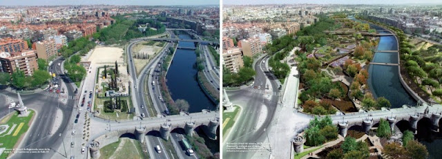 Muito interessante e ousada a visão de Madri, capital espanhola, para recuperar o rio que corta a cidade – as rodovias marginais foram enterradas em túneis e os imensos espaços ao ar livre, antes ocupados pelos carros e tráfego intenso, transformados em jardins e praças.