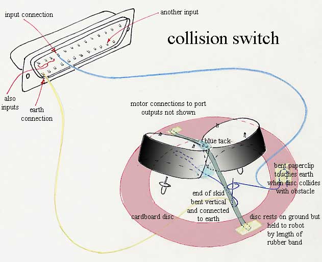 The reason the robot has no wheels is that the printer port only just supplies enough current to run a high-impedance motor (walkman motor or Mabuchi solar motor) quite slowly; any form of cheap