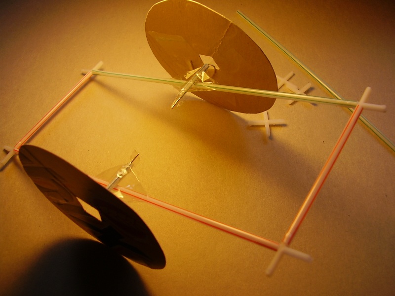 The other one works by using a paper clip instead of the cotton, this involves making a hole which is a loose fit on a paperclip. The bits of straw rest on spacers made of more bits of straw which are a tight fit on the paperclip. If you blow in the middle the bits of straw rotate in opposite directions.