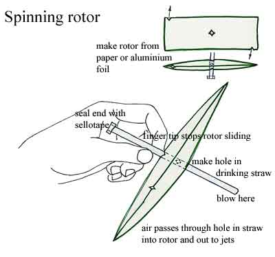 This can be made out of almost anything, eg a sweet wrapper or aluminium foil . It can be made without sellotape even but you must have a drinking straw and some means of making a hole in it. If you make them one-ended they sound like a steam train. If you have a pin, you can use it to locate the spinner over the hole instead of your finger tip. Stick it through the straw so that the spinner rests against it. Now you can make several on one straw, different types, different directions etc. Attach one to a hat with a bendy straw to blow through.