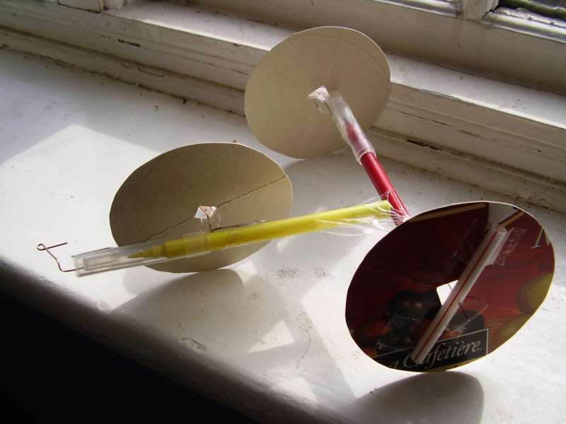This is a windmill made with three wheels stuck tangentially to a bit of card, you blow it round with a hand-held fan. The wheels need to be quite round for this one