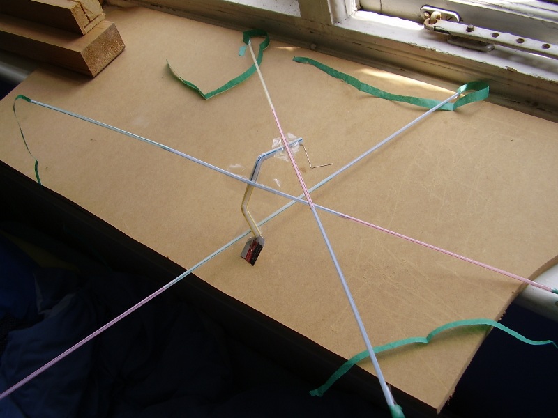 This is an indoor dogfight based on two universal joints, each one 45 degrees so it forms three axes. One in the middle & one each side. A long cross-arm is attached to each axis with sellotape