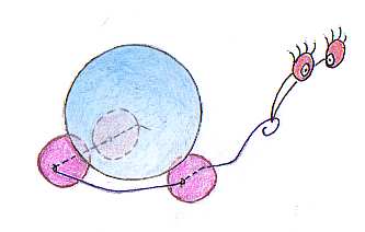 bend paperclip, thread on three plastic beads as shown, rest marble on beads so that when you pull the paperclip the marble rotates in the opposite direction from that in which the vehicle is moving. Make head from bit of string, paper eyes etc.
