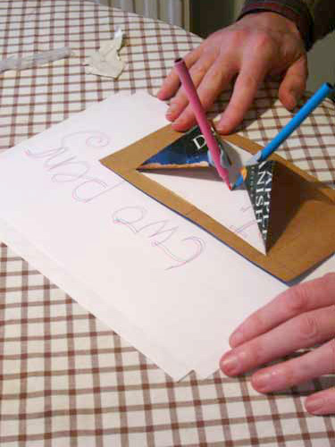 You blue-tack two felt tips to the swinging arms formed by folding the card. Try to get the tips close together but not touching. I think it's probably possible to modify it to work with more than two pens. You can use it at the end of a harmonograph arm.