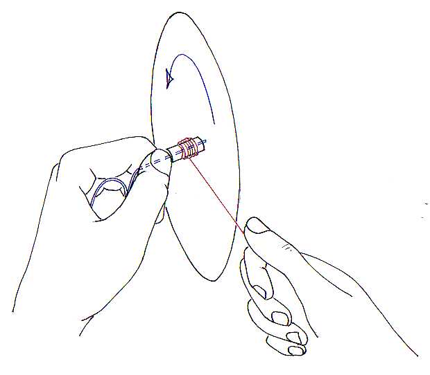 the blades of the spinner are made from mirror-finish inkjet film, they are positioned so that the laser aims at them as they go round. It doesn't work with mirror-plastic because it's too heavy & inertia takes charge. The other end of the pointer is attached to a paperclip which is bent round the barrel of a pen. So that when you hold the pen you can spin the pointer round & round which causes the spinner to turn. You can do it surprisingly consistantly, for best results hold near a wall in a dark room, for truly spectacular patterns whirl it round horizontally in an (empty) bath.