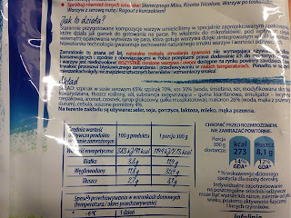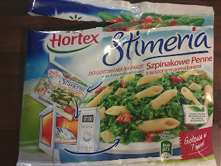 Skład : szpinak w sosie serowym 65%: szpinak 70%, sos 30% (woda, śmietana, ser, modyfikowana skrobia kukurydziana, tłuszcz roślinny, sól, substancja zagęszczająca - guma ksantanowa, emulgator - lecytyna rzepakowa, aromat, czosnek, syrop glukozowy, gałka muszkatołowa); makaron 26% (woda, mąka z pszenicy durum), cebula, suszone pomidory 4%.