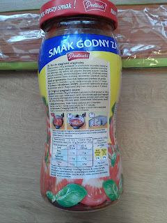 Skład : pomidory (88g pomidorów (w przeliczeniu na produkt świeży) w 100g produktu), cebula, cukier, skrobia kukurydziana, marchew, koncentrat soku jabłkowego, olej roślinny, sól, jarzynka (warzywa suszone (marchew, pietruszka, pasternak), ekstrakt drożdżowy, cukier, sól), przyprawy, aromaty, regulator kwasowości (kwas cytrynowy) koncentraty (porzeczki, marchwi).