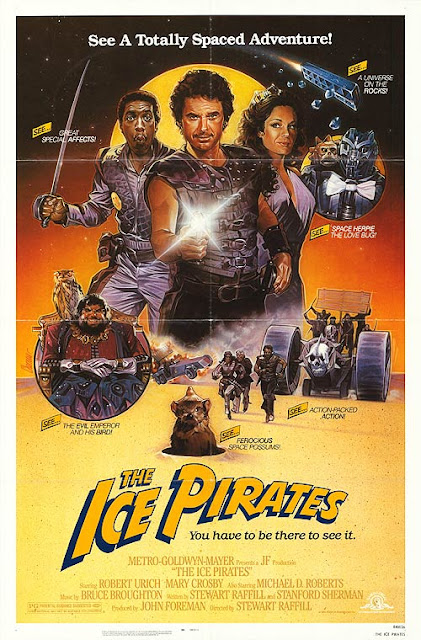 | La locandina e la scritta, un po' stile Indiana Jones, anticipano ed esprimono chiaramente lo spirito goliardico, citazionista e zuzzurellone del film. Notare anche il feroce space possuns che rivedremo sbucare dalla sabbia anni dopo nella quarta pellicola dell'eroe di George Lucas e Steven Spielberg. |