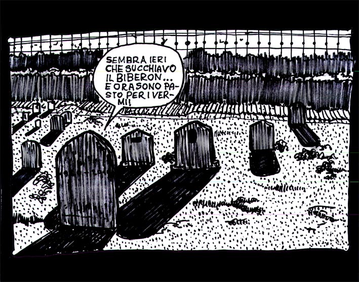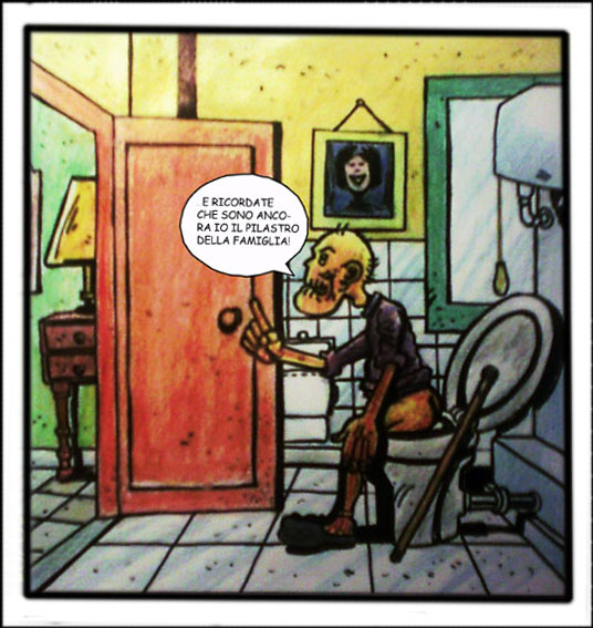 La pensione (forse), i pannoloni per gli incontinenti (quasi sicuramente), la prostata ingrossata (i più fortunati) etc. Questa, sappiamo, è la condizione che ci aspetta più o meno a "fine corsa", tutti doni involontari della vecchiaia. Sappiamo pure che nell'avanzare dell'età si ritorna un po' bambini illudendosi che la vita stia ricominciando. Così tra il viagra e una supposta, un vaccino anti influenzale e una fiala di enterogermina, l'anzianità ci prende per mano conducendoci verso quella che sarà la nostra dimora definitiva... In quel mentre c'è tutto il tempo di spaccare ancora un po' i coglioni ai parenti più stretti. Così come fa nonno Femore il vecchio scoreggione, nella vignetta.