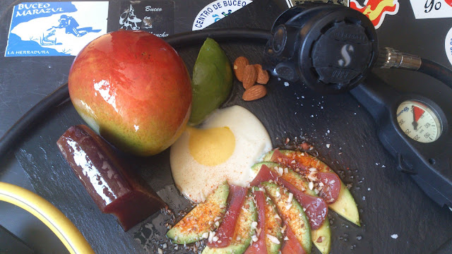 y mi creación para esta ocasión no podían faltar esos productos tropicales tan característicos de la zona, de los que he elegido : el aguacate, el mango, y la chirimoya , y del mar he elegido la mojama en recuerdos a aquellos aperitivos en el centro de buceo.