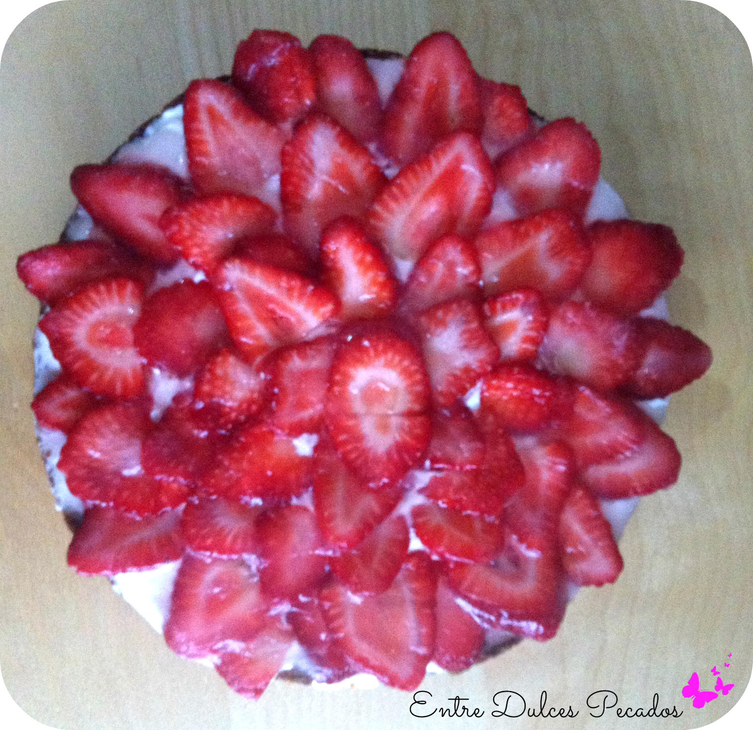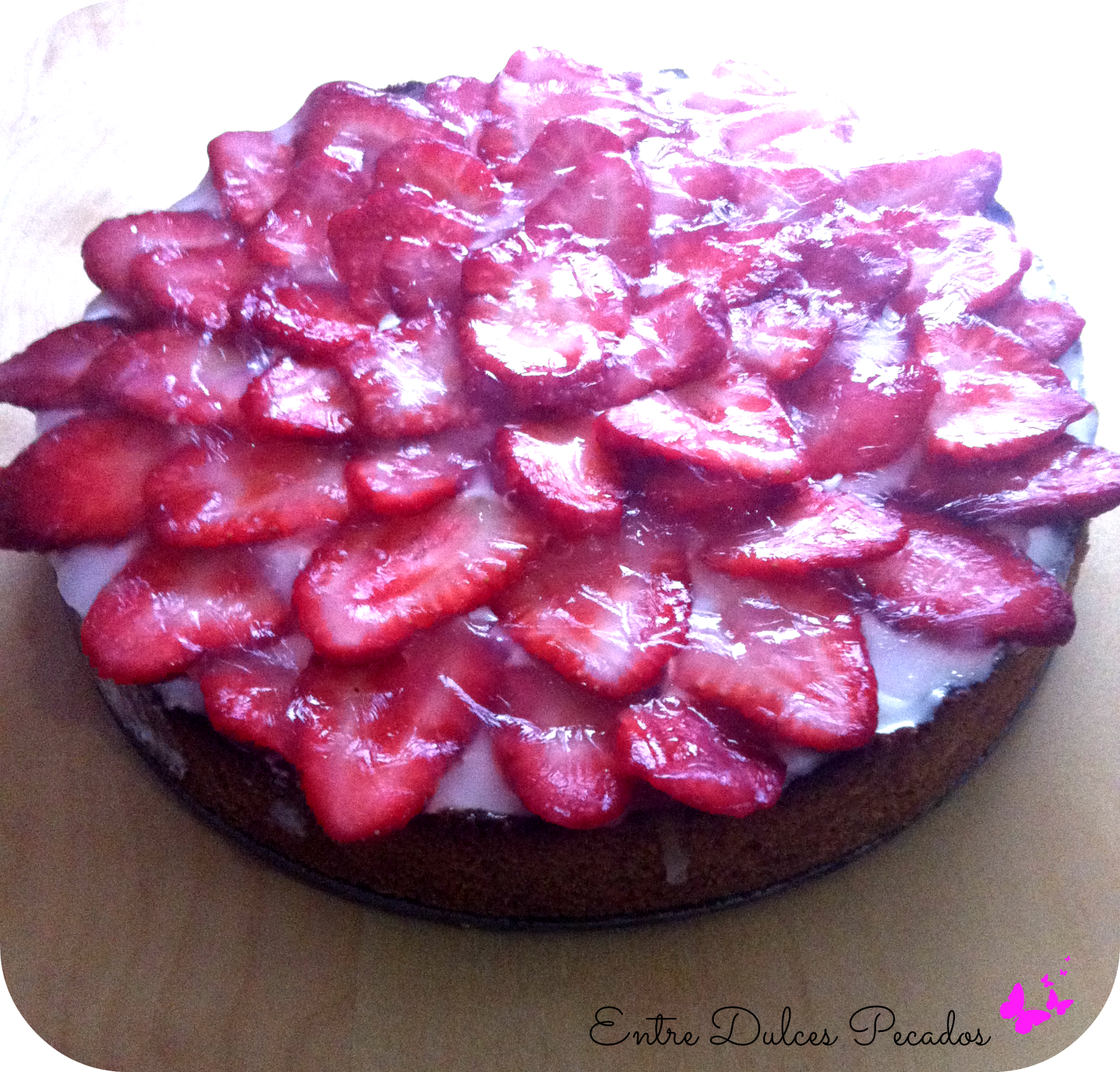 - Al día siguiente cortamos las fresas en láminas y cubrimos nuestra tarta con ellas.