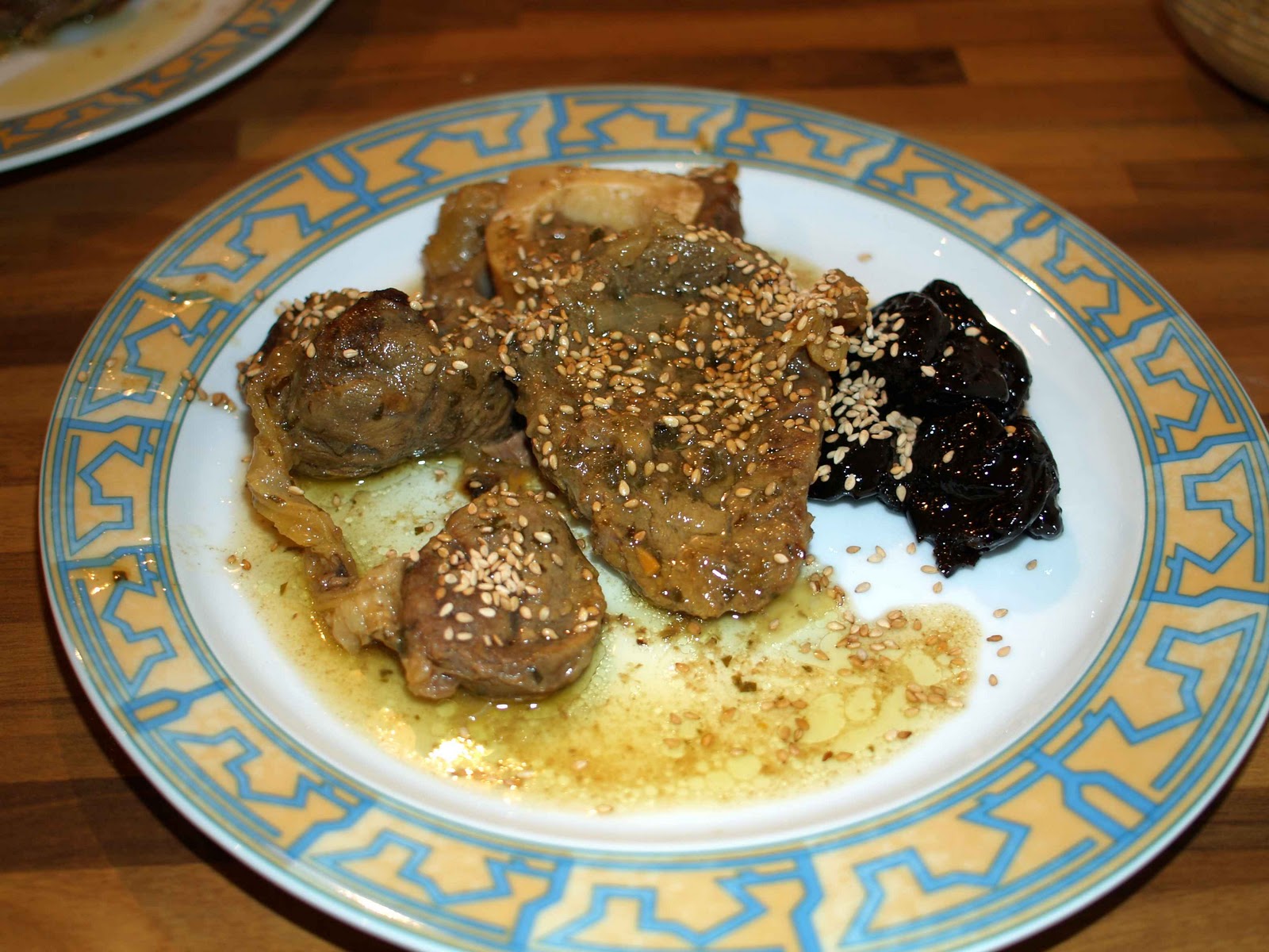 Quando è finito tutto servi la carne col suo sugo nel piatto vicina a qualche prugna caramellata e spolverizzi col sesamo.
