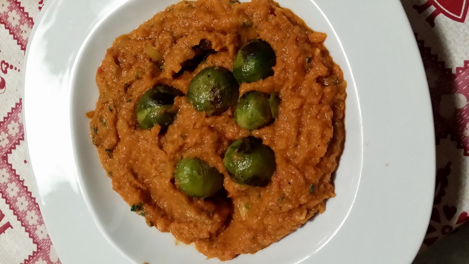 Frullo metà dei cavolini nel sughetto; però che bella crema arancione, chi l'avrebbe detto. Un filo d'olio ed è perfetta, assieme a una presa di prezzemolo tritato.