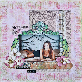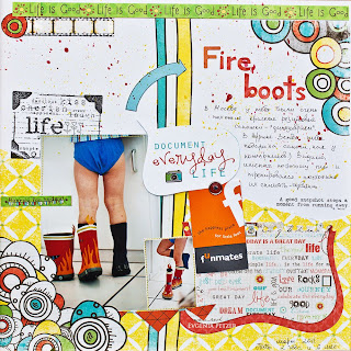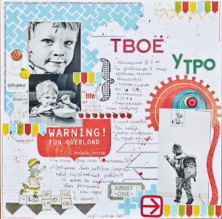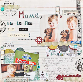Вся бумага, использованная в работе Basic Grey. Использовала листы из серии Oliver- вот этот и этот. Также использовала штамп Тима Хольтца, самоклеющуюся ленту, фотопленочку. Пуговки, натирки. Кусочек упаковки от игрушки щенка, принтер Dymo