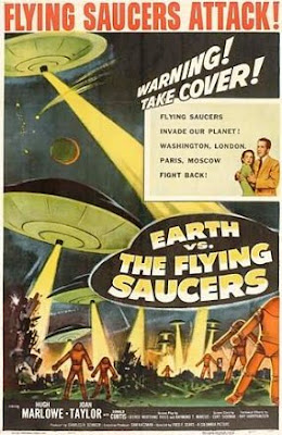 The Ray Harryhausen film series at the Trylon Microcinema here in the Twin Cities kicked off this weekend. I'd blogged earlier that I've seen most of the fantasy films he's done, but none of the sci-fi ones. I corrected that oversight this afternoon with a viewing of Earth vs. the Flying Saucers! It's definitely one of the all-time great B-movies, from the height of the cold war and UFO craze of the 50s. The film shares a lot of plot devices similar to War of the Worlds (Earth is invaded by a technologically superior race, etc.) but instead of conquering them through micro-organisms, lead scientist/hero Dr. Russell A. Marvin played by closet-werewolf and crackerjack actor Hugh Marlowe (if you've seen the last scene of the film you'll get that joke) devises a weapon to fight off the aliens. Of course, conventional artillery and firearms are useless because the aliens are using SCIENCE! So we have to use our own to even the odds. Let's just say it's definitely overdue for a Mystery Science Theater 3000 skewering. :)