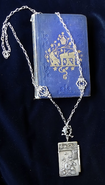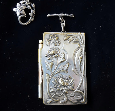 Un oggetto di altri tempi meravigliosamente cesellato con motivi floreali sia fronte che retro, che le dame portavano ai balli per annotare l'ordine delle danze richieste dagli spasimanti. Ho montato il carnet in modo che fosse possibile portarlo da una parte o dall'altra, così sarà come avere due collane in una. Ho completato il montaggio con una catena dalle maglie insolite e degli elementi floreali che si sposano coi decori del carnet. Il carnet ha ancora il blocchetto e portamine originali. Questo è per un'amica scrittrice e poetessa, non so pensare a niente di più indicato per un'artista della parola.