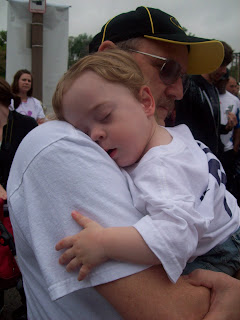 The day started early. We hoped to be at the walk site in Forest Park by 8am. The walk was slated to begin at 9. That meant our day began around 6. As Robbie doesn't normally rise until after 8, he was a little discombobulated, but mostly in a good mood.