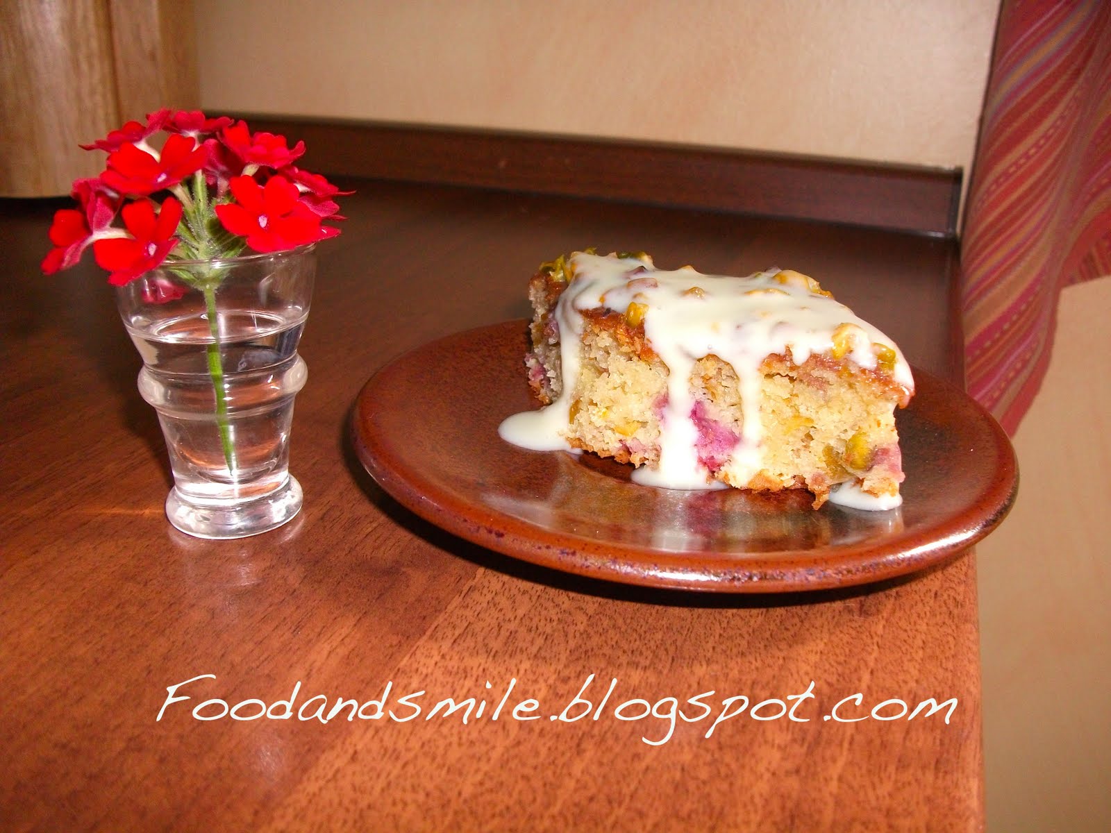 Ecco il risultato finale, io l'ho tagliato anche per farvi vedere la consistenza!Vi assicuro una goduria, troppo morbida!!Mi è venuta più bassa della ricetta che avevo visto ma penso proprio sia dovuto al fatto che ho utilizzato uno stampo troppo grosso per la quantità che avevo!La prossima volta comunque oltre al lievito , monterò anche gli albumi separatamente!Il sapore dei pistacchi, leggermente salati, è ben ripreso dai lamponi dolci ma comunque aciduli quel giusto da equilibrare il tutto!!Per non parlare del cioccolato bianco...che con i pistacchi è troppo azzeccato, l'avevo scoperto con uno dei nuovi gelati ora in circolazione..:) al di là del fatto che i pistacchi quest'estate vanno di moda a quanto pare...
