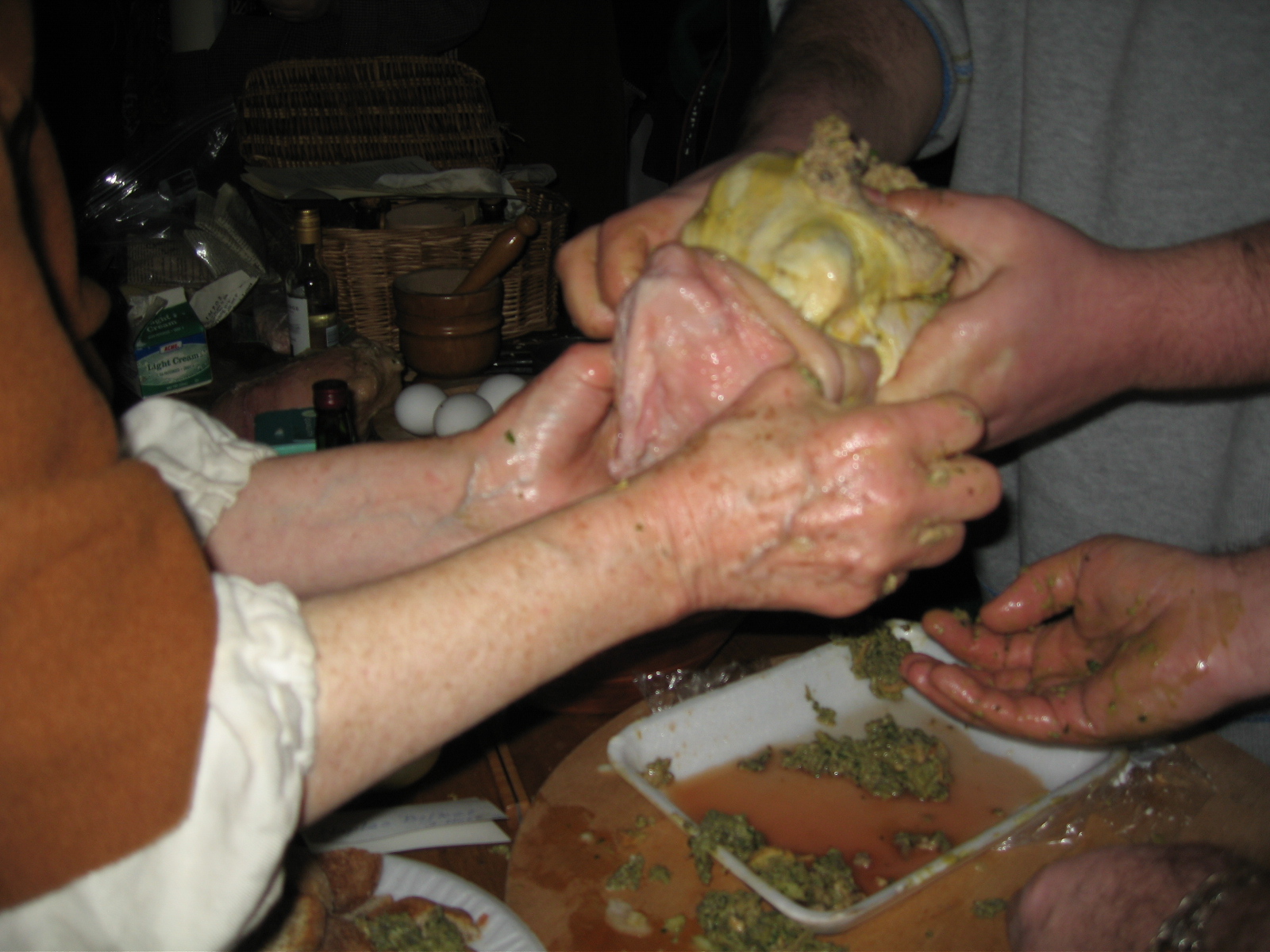 The featured recipe we recreated was from an 18th century source, "Chickens in Bladders." You essentially take two small chickens, stuff them with a bread crumb and oyster dressing, then tuck meatballs under the skin, then shove the whole thing in a cow's bladder. Our teacher, Clarissa, stretched out the cow's bladders by cutting off one end and forcing her hands inside, in procedure that looked either like a reverse birth or an old timey freak show. The chickens were then coerced inside and the whole thing was boiled for about two hours. When they came out, they looked like human balloons.