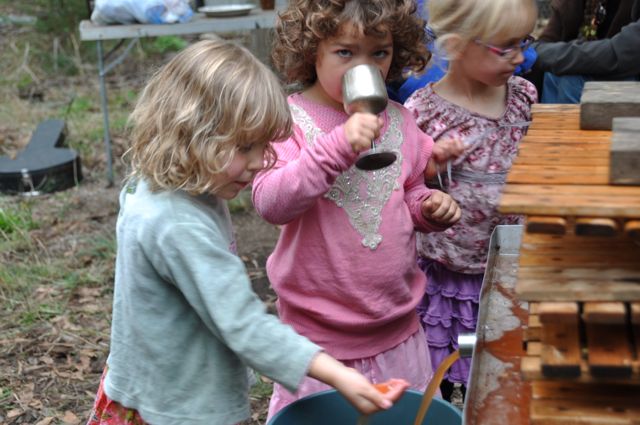 Farmer Bren brought along his cycle powered apple scratter/grinder/mulcher and others brought their inventions too. Whole apples are fed into the top and turned into apple mush that comes out the other end.