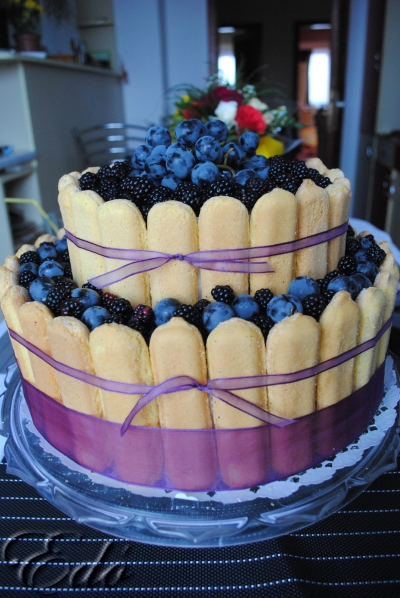 - A két tortát egymásra helyeztem, babapiskótával körberaktam, majd szederrel, kékszőlővel díszítettem.