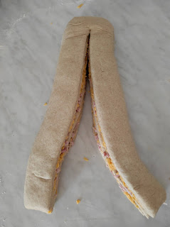 - Mindenik palacsinta közepére 1 evőkanálnyi húsos ragut helyezünk, és mind a négy szélét ráhajtjuk, majd felcsavarjuk.