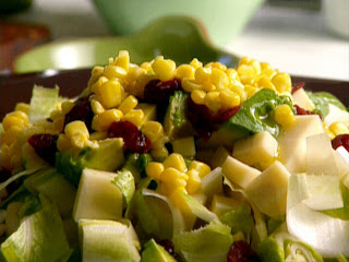 Put the endive and apples into a large decorative serving bowl. Squeeze the juice of half a lemon into the bowl and toss to coat the endive and apples so they don't turn brown. Add the cheese and avocado, and then add the cranberries and corn.